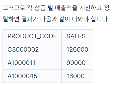 GROUP BY 매출액을 기준으로 내림차순 정렬, 상품코드를 기준으로 오름차순 정렬