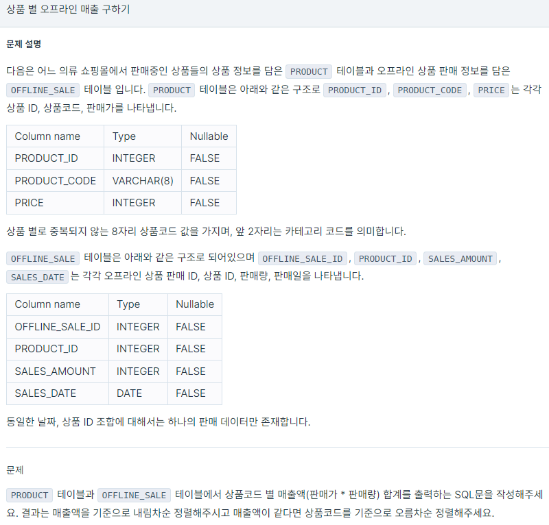FROM PRODUCT 테이블, OFFLINE_SALE 테이블